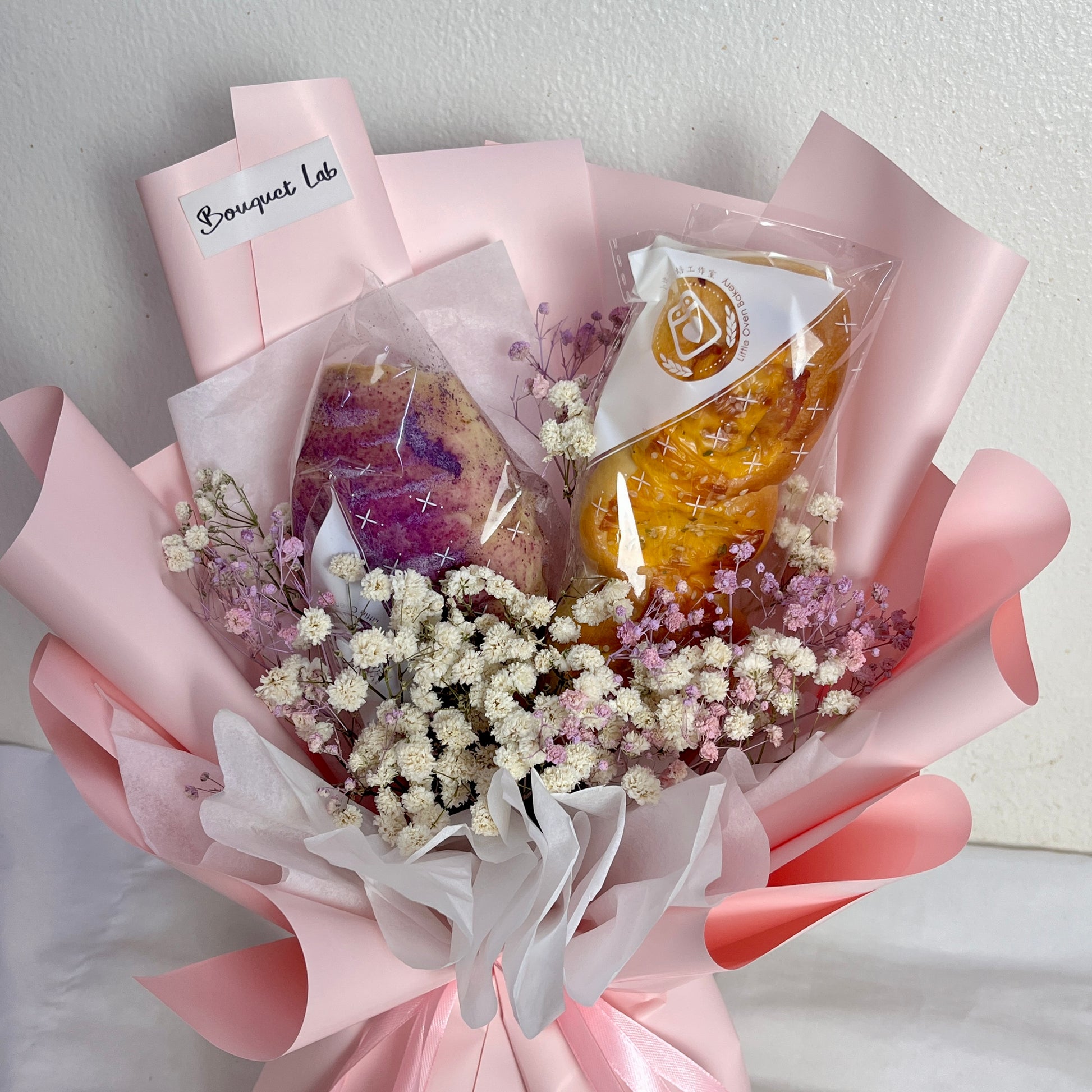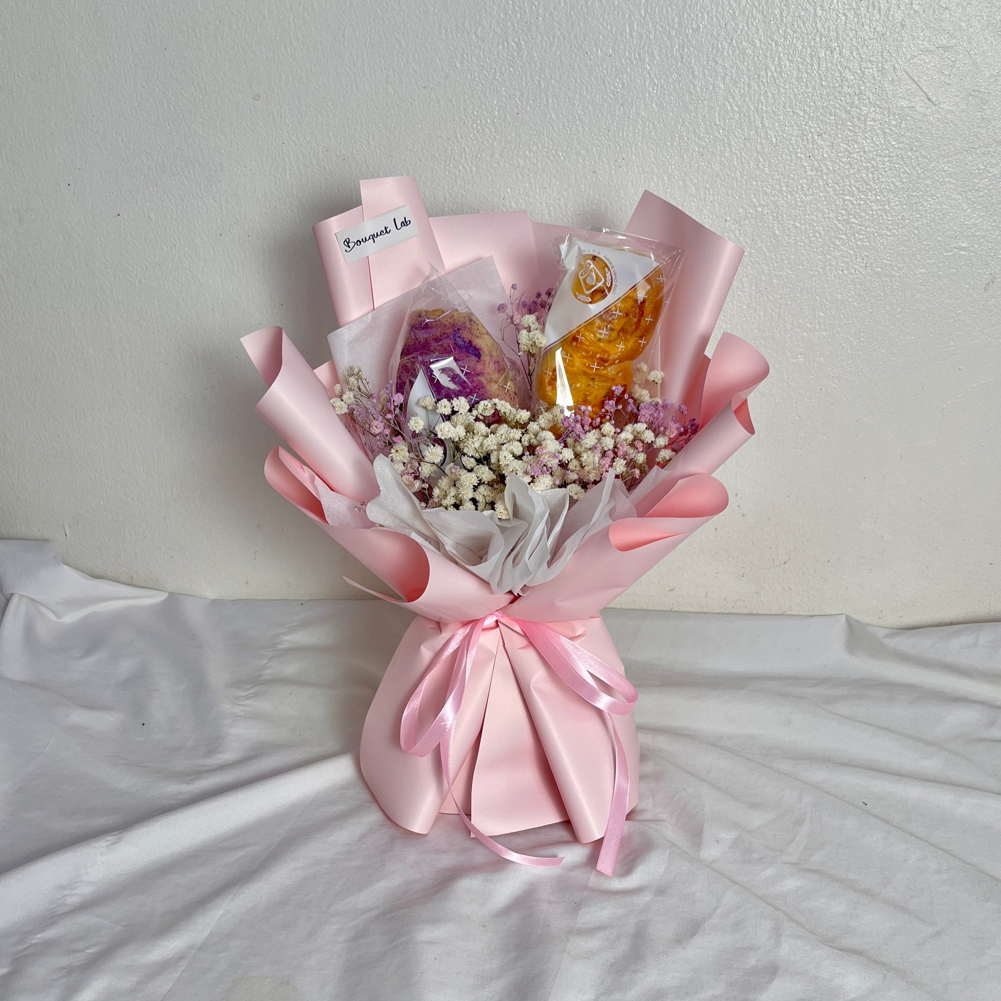 A unique combination of fresh bread and flowers, blending warmth and beauty in one charming bouquet—perfect for a thoughtful and creative gift!