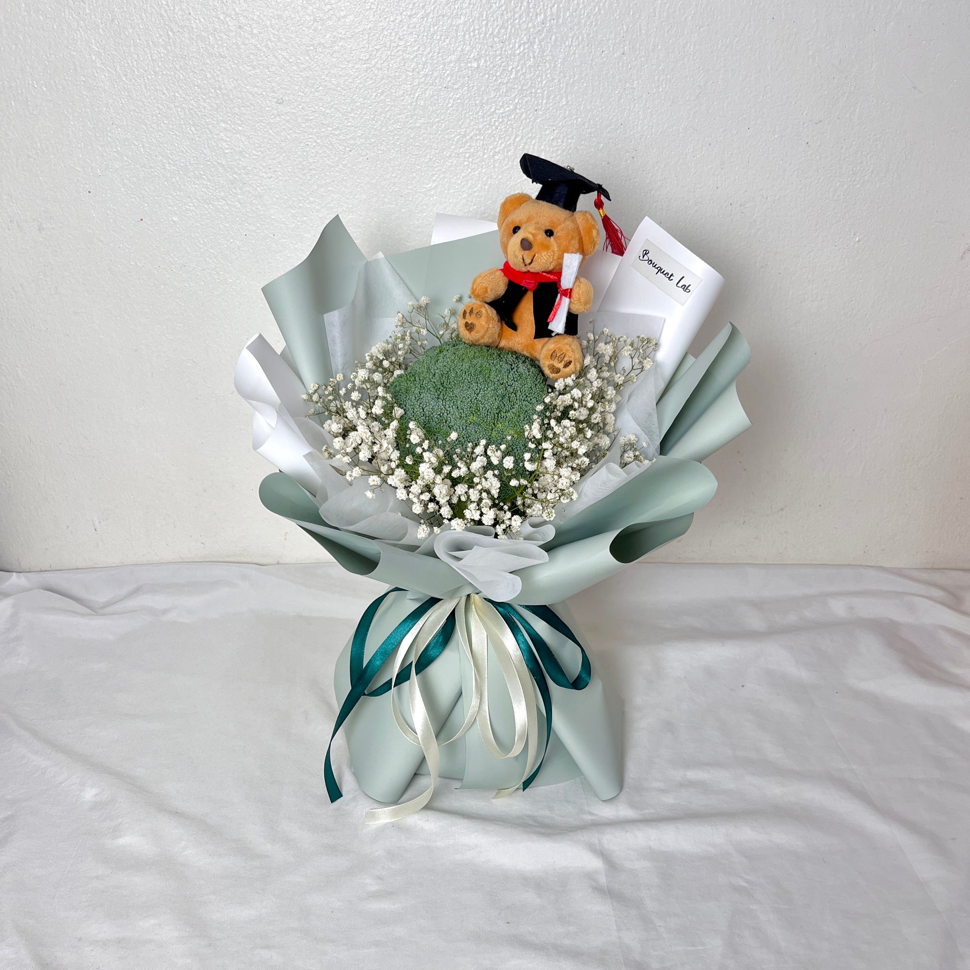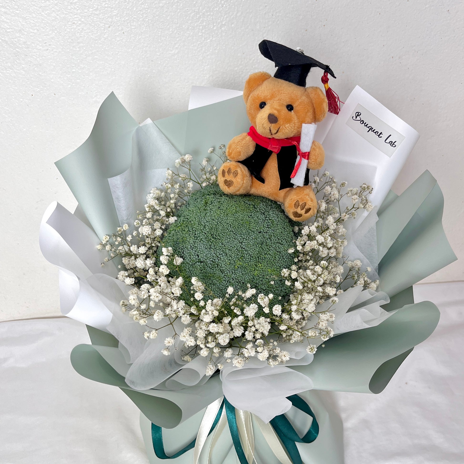 A unique and meaningful gift to celebrate any graduation! This bouquet features a fresh broccoli paired with an adorable graduation bear — symbolizing growth, health, prosperity, and success. Perfect for students, friends, or loved ones stepping into a new chapter.