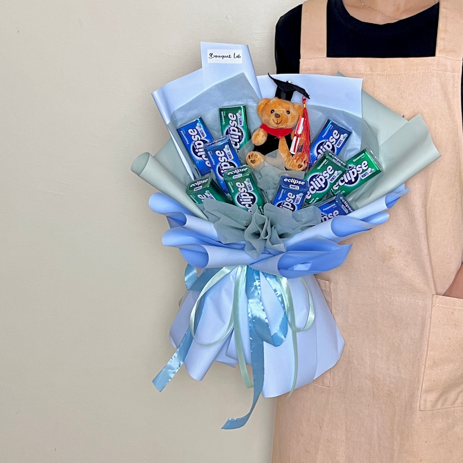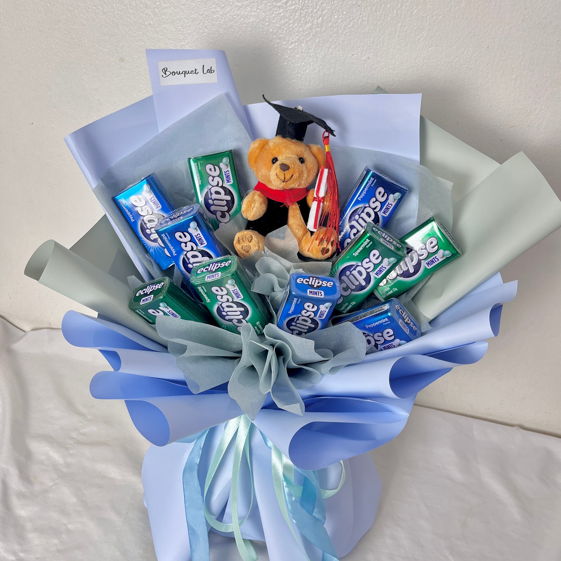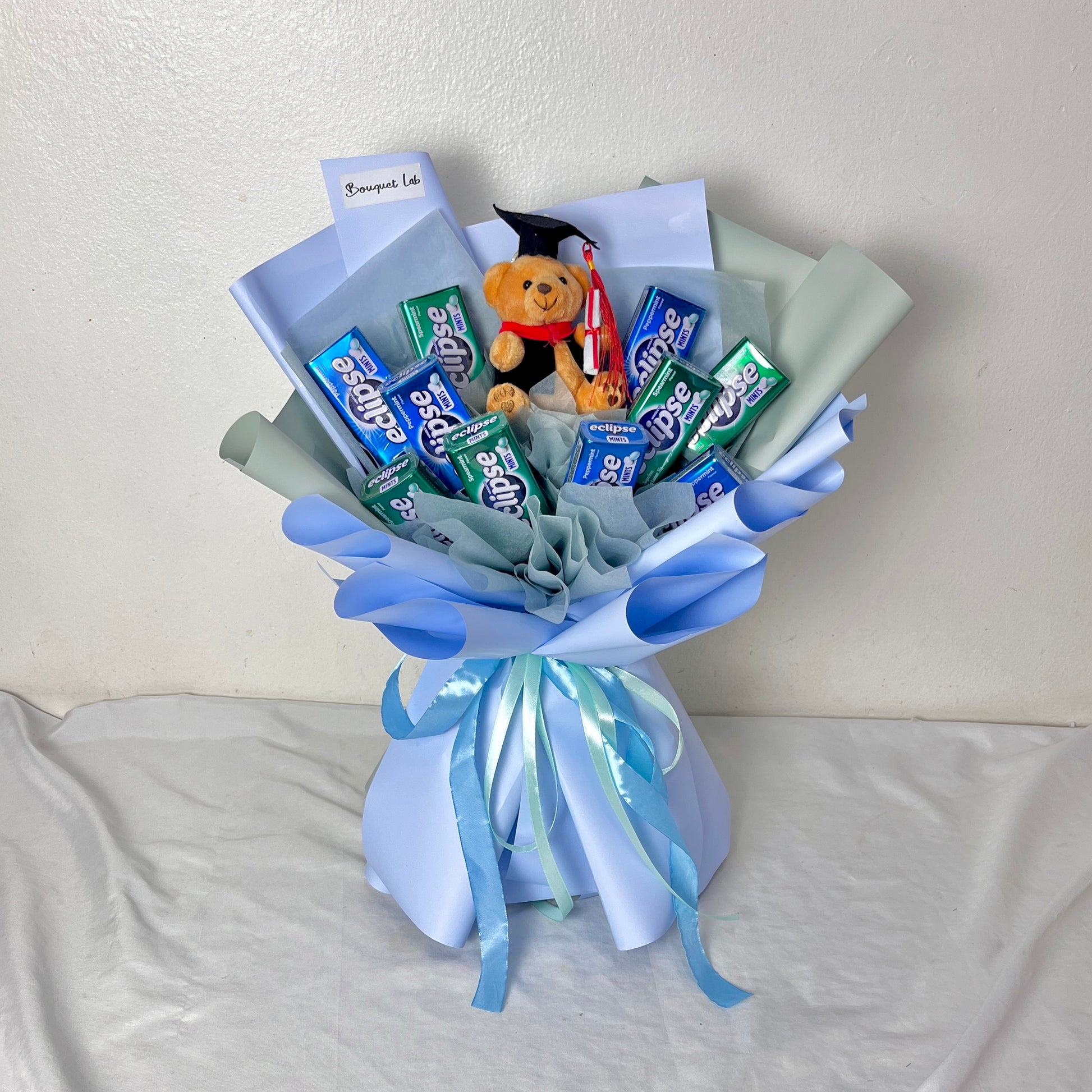 Mark their milestone with a bouquet that’s both meaningful and refreshing. This bouquet pairs the cool, invigorating taste of Eclipse mints with an adorable graduation plush — all wrapped in stylish, modern florist wrapping.