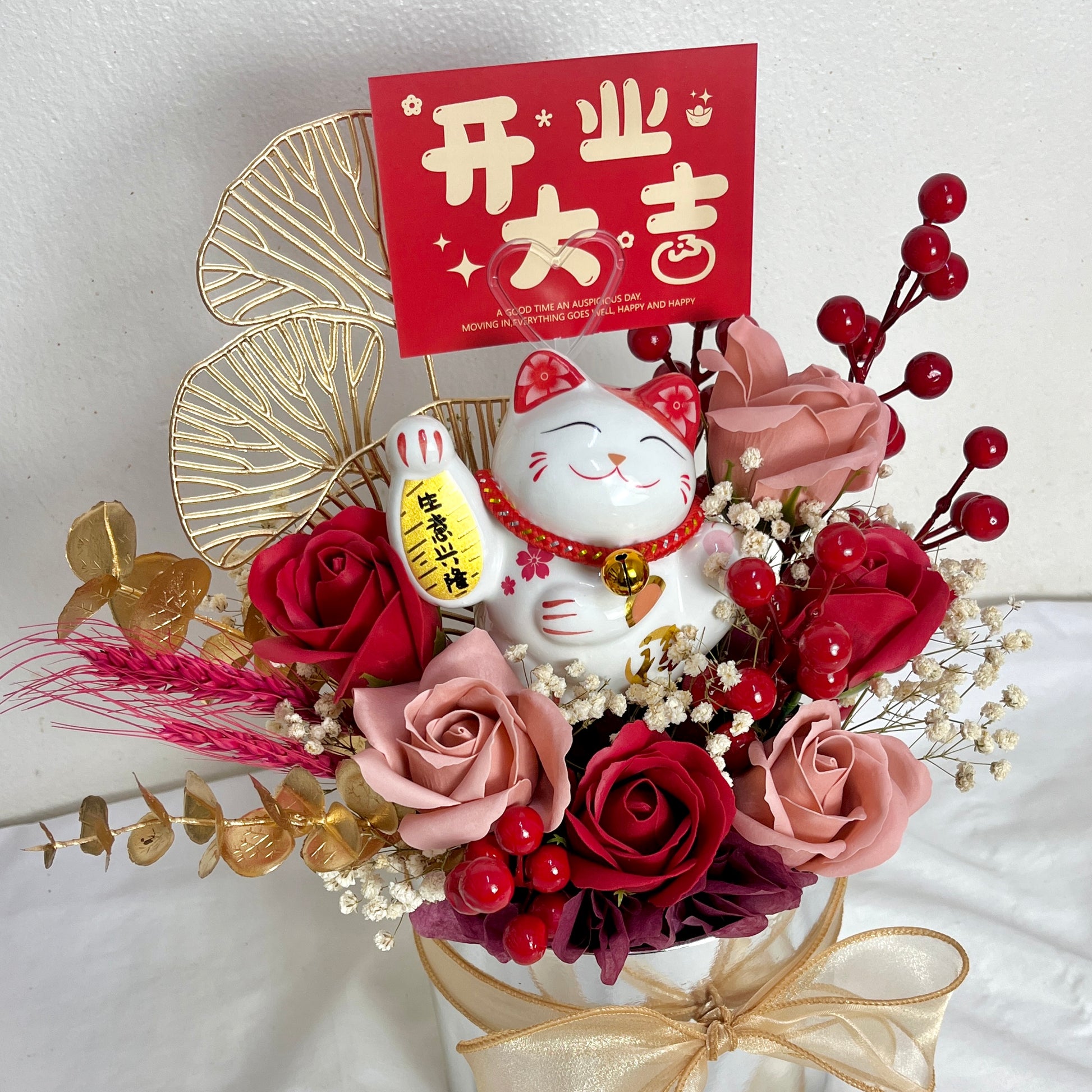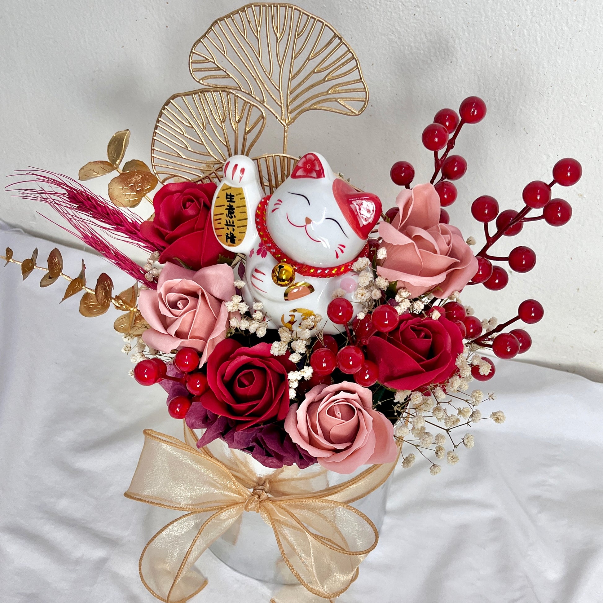 - A Lucky Cat (4"), 6 Soap Rose Stalks and Fillers.