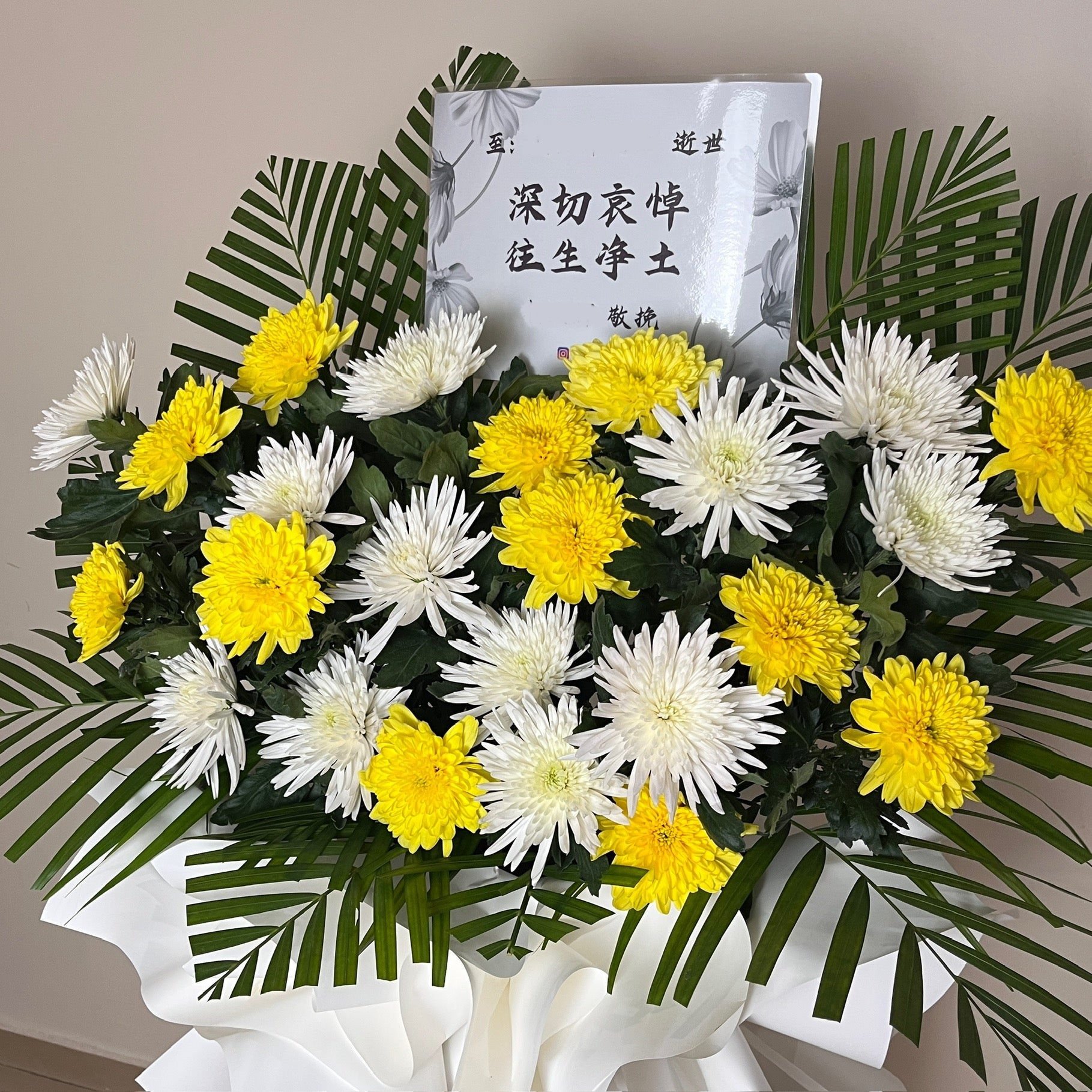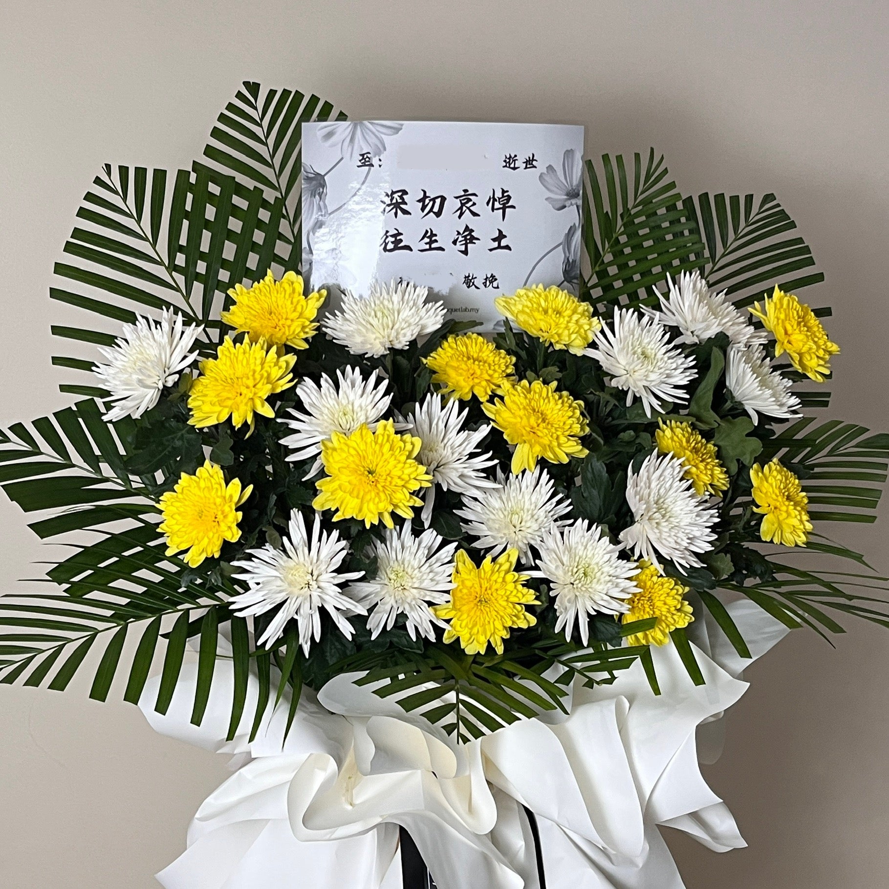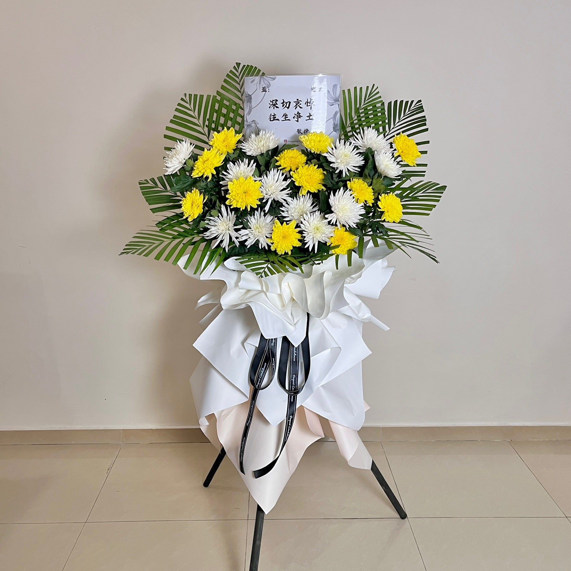 A soothing expression of sympathy in calming white and hopeful yellow tones. Designed to bring comfort and warmth during a difficult time, this floral stand conveys heartfelt condolences and quiet strength to the bereaved family.