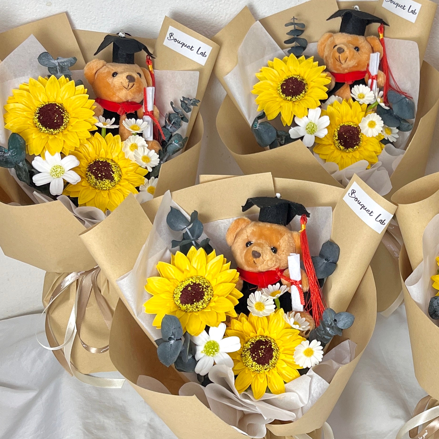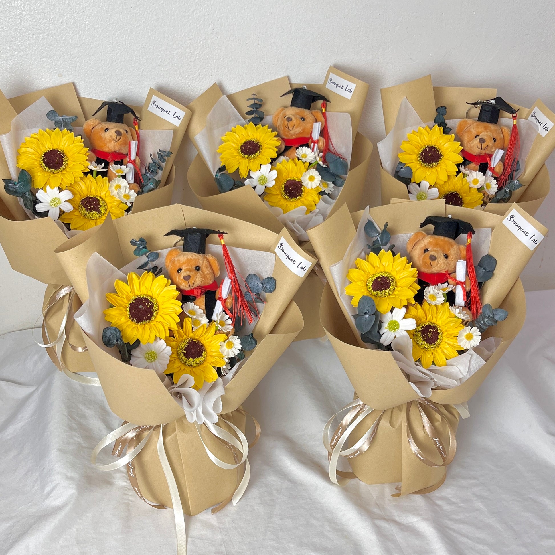 This bouquet features an adorable plush graduation bear wrapped in a compact, elegant small bouquet casing—perfect for easy gifting during ceremonies and celebrations. Simple, cute, and meaningful, this bouquet makes a thoughtful token of encouragement for graduates of all ages, from kindergarten to university.