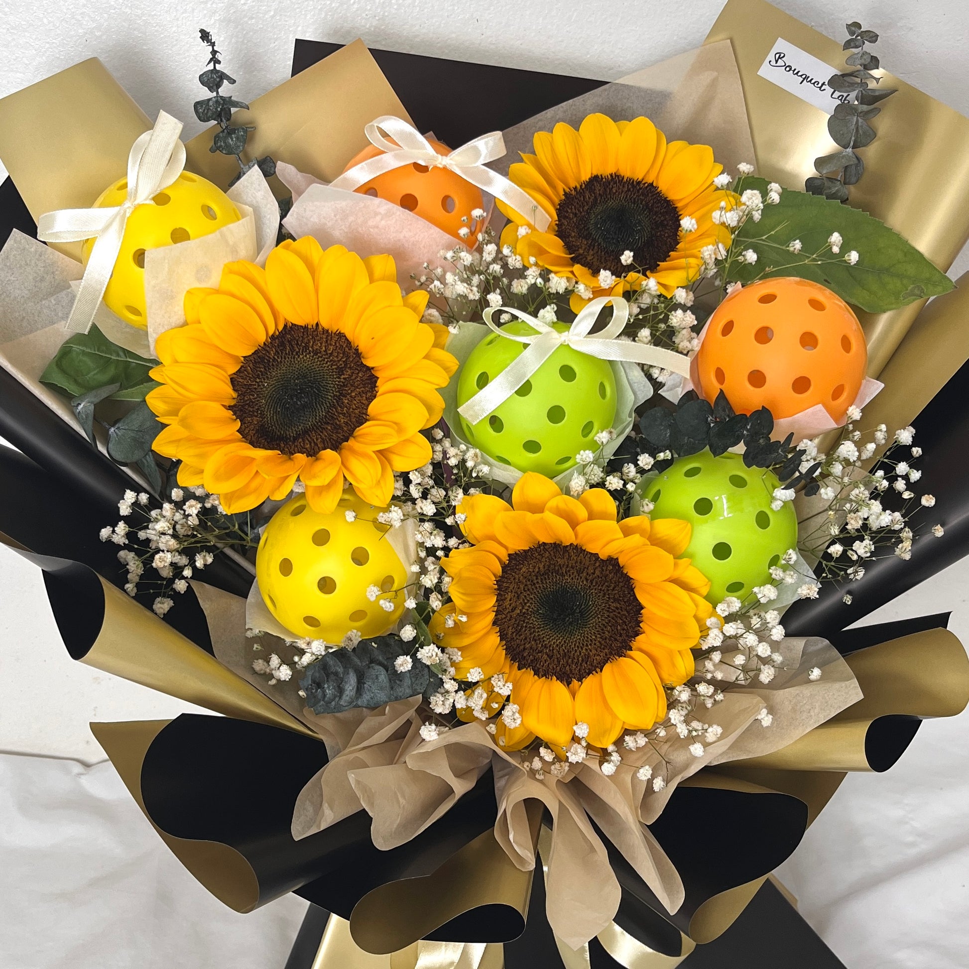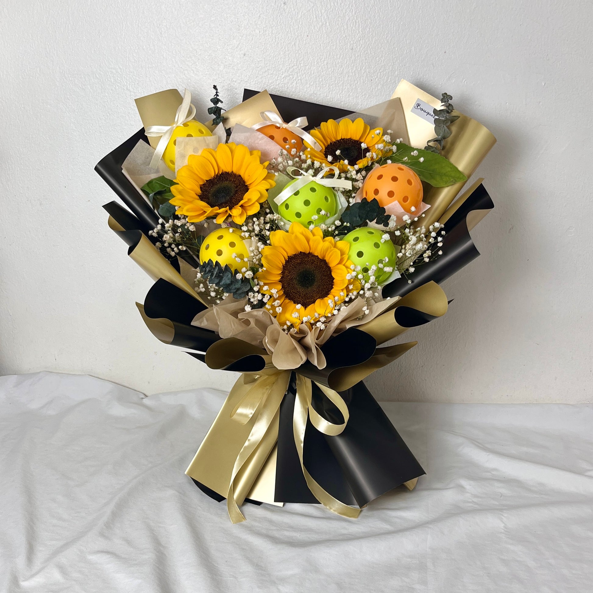 Brighten someone's day with this sporty-meets-sunny bouquet featuring vibrant sunflowers and a playful touch of pickleball charm. Perfect for athletes, coaches, or that sunshine-loving friend who lives life full of energy and good vibes. Whether it’s a gift of encouragement, celebration, or just for fun — this bouquet scores big on joy and style.