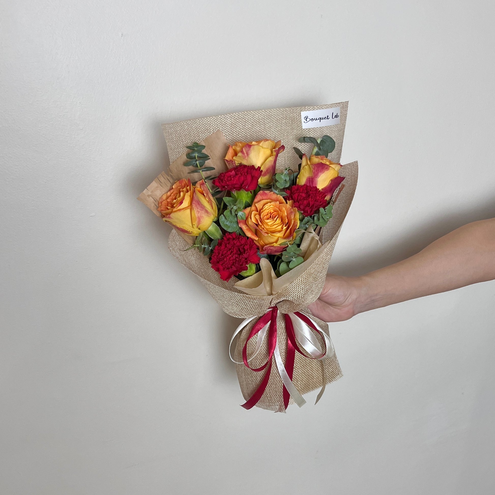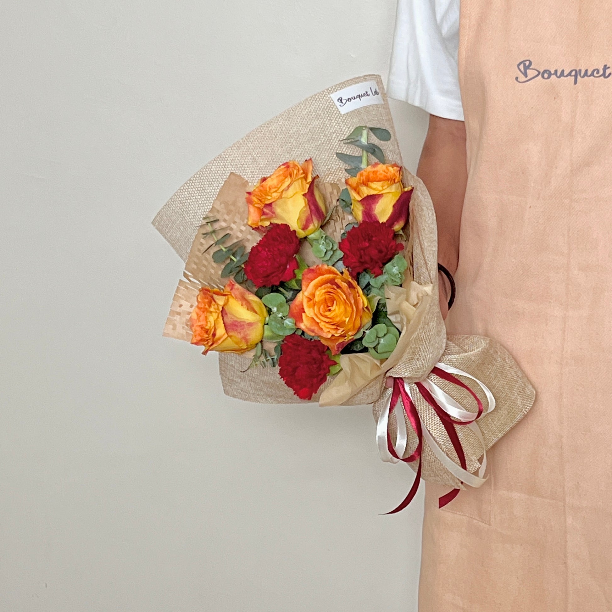 A warm and cheerful bouquet featuring orange roses symbolize enthusiasm and appreciation, while red carnations represent deep love and admiration.