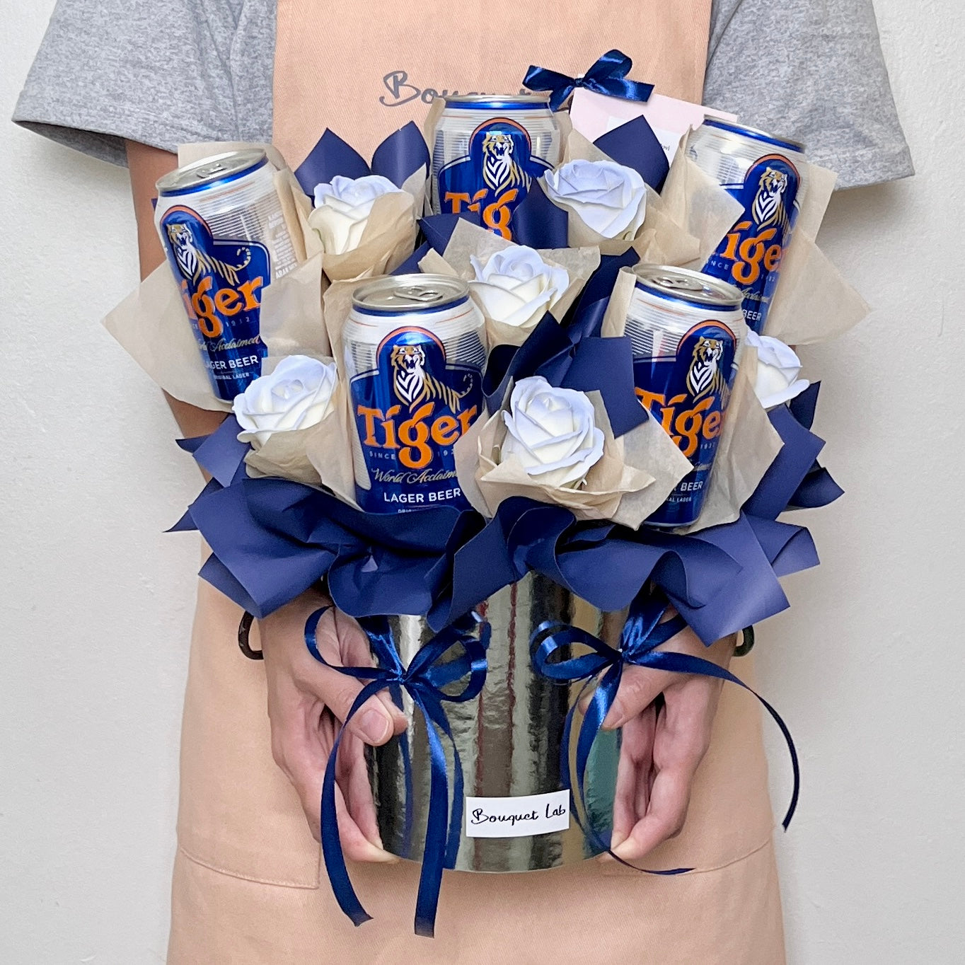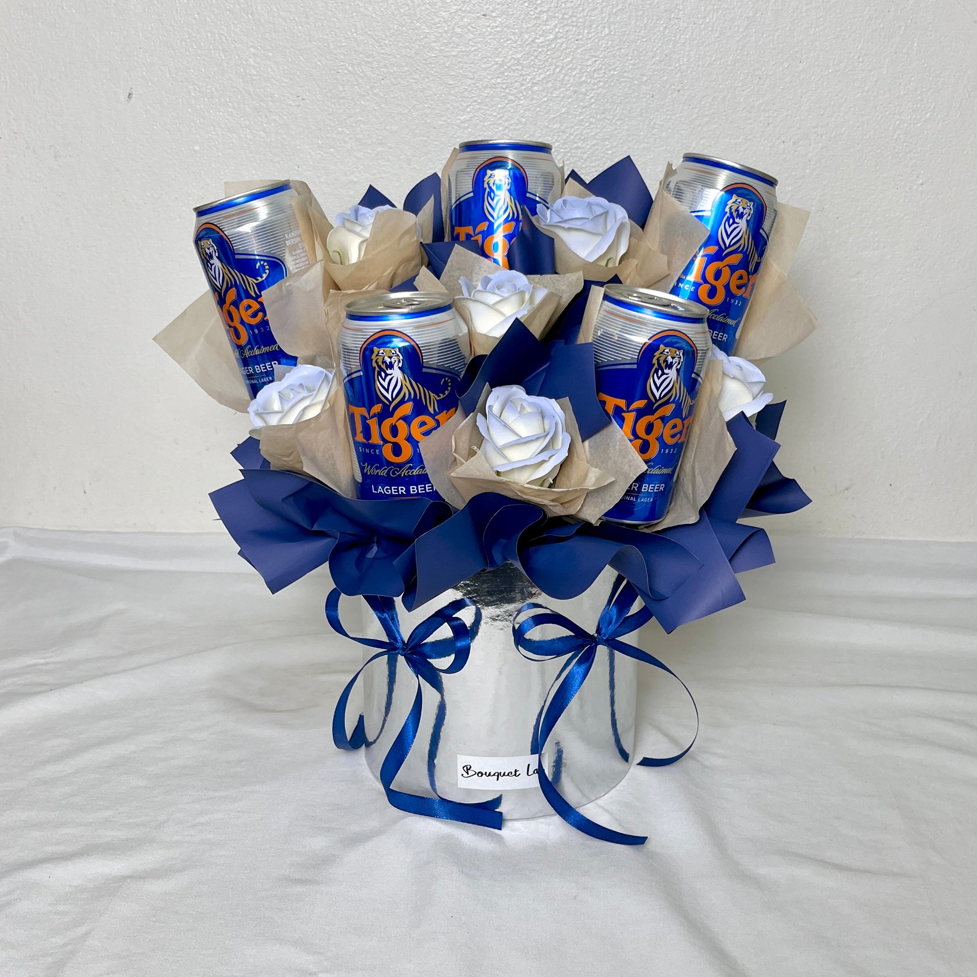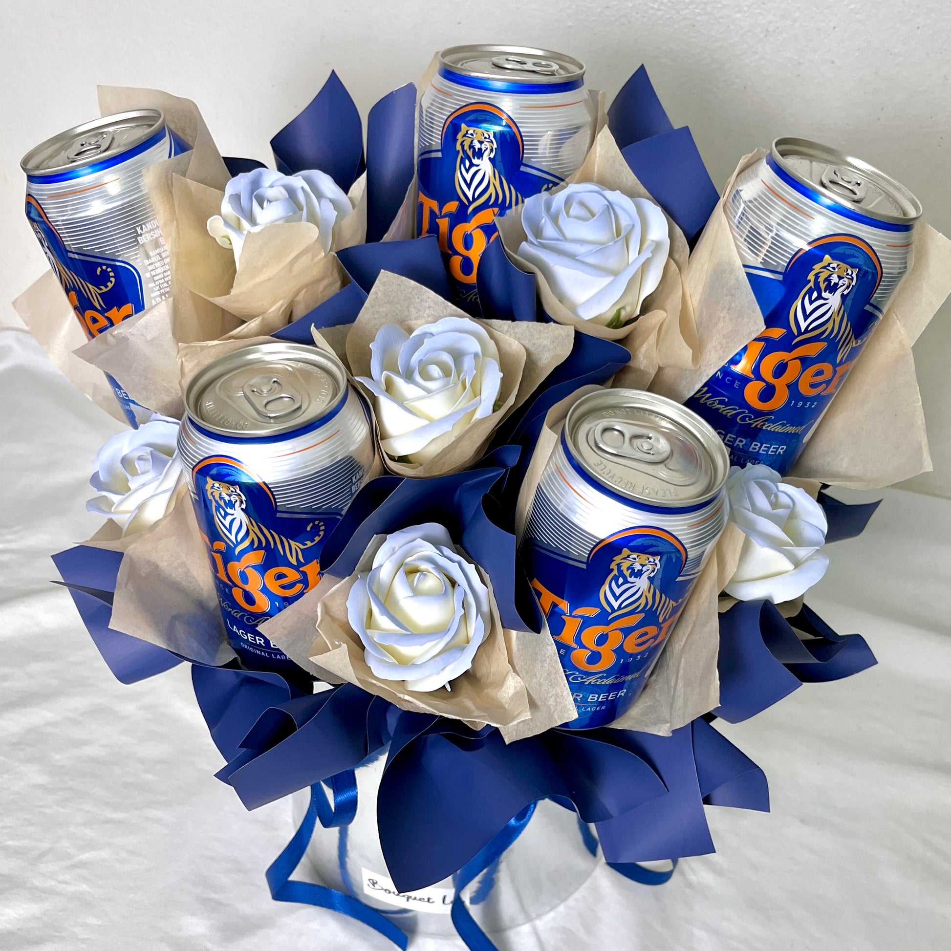 - 5 cans Tiger beers and soap flowers.